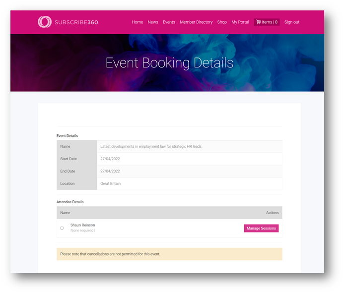 Subscribe360 comes with an Events Management system, with the members portal able to show member-only events and provide a booking management facility, allowing sessions to be changed or the whole booking cancelled, subject to the terms of the original event.